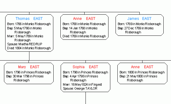 The third tree is the All Relatives East family tree I have had to split this into 2 sections, the Easts and the Eggletons, this first section is all the descendants of William Este who died in 1534 Everybody named East and anybody who married an East plus their children are shown on the tree. The boxes contain all Full Names, Birth, Baptism, Marriage, Death, full dates and locations only where the information is included in the file. There is a printed border around the outside of the chart. Here is an overall view of the tree, you will not see much detail and the quality of this picture is quite poor because we have had to reduce it a great deal and this makes it go blurred but it will give you an idea of the overall appearance and layout. What appear to be single black marriage lines on this screenshot picture are in fact double marriage lines and will print as double lines not single black ones, you can see these marriage lines better in the second picture below.